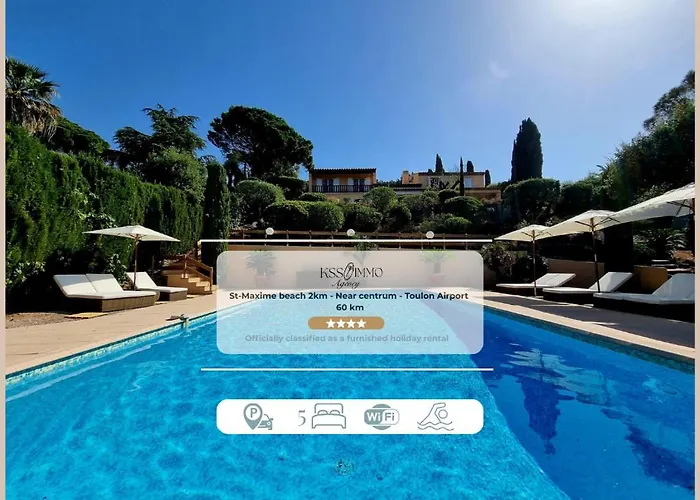 Villa 4 Etoiles - Parking - Wifi - Clim - Piscine boasts an equipped kitchenette offering to make use of an electric kettle, a refrigerator, and an oven. Guests can dine in Le P'tit Resto, 2.3 km from the Sainte-Maxime property. Located in proximity to this Sainte-Maxime accommodation, La Nartelle bus station offers transportation choices in the vicinity.